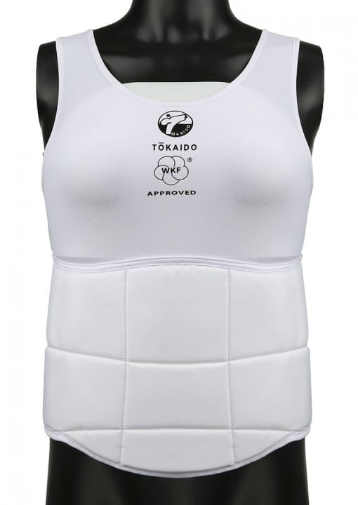 Leggero pettorale Tokaido sviluppato appositamente per le donne che praticano il karate e altre arti marziali. La forza dei colpi viene assorbita efficacemente. Protezione affidabile per tutta la parte superiore del corpo, sia per l’allenamento che per la competizione. Approvato dalla WKF. Regolabile con velcro.